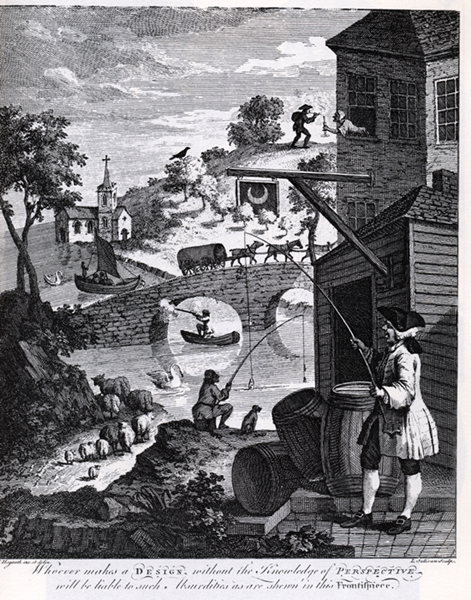 Aquí tenim un exemple fet per William Hogarth (1696-1764) en el que hi trobem diferents jocs de perspectiva. Es tracta de l’obra Sàtira sobre la Perspectiva Falsa on hi ha fins a 22 “errades” o trampes de perspectiva (L’home que està al camp conversant amb la dona de la finestra, el cartell suportat a dos edificis diferents, les dues canyes de pescar…)
