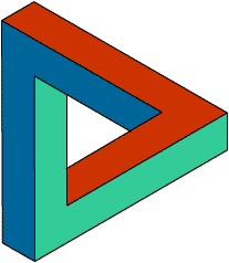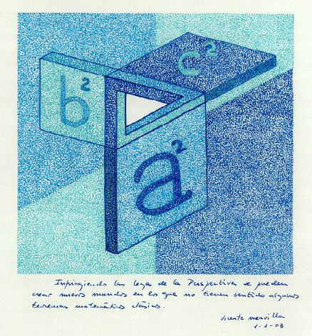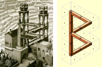 • figures impossibles: es poden dibuixar, però no es poden construir a la realitat, com aquesta versió impossible del Teorema de Pitàgores creada per Vicente Meavilla.