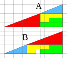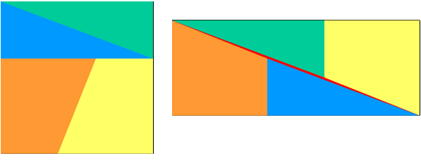 Com en el cas del quadrat de 8×8 les peces no encaixen exactament i es creen forats i superposicions que fan aparèixer misteriosament aquest forat del no-res.