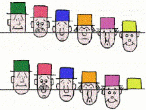 Si tornes a mirar les figures dels barrets veuràs que en la 2a configuració totes les cares s’han allargat dissimuladament. A la 1 cara li “surt” barbeta, a la 2a boca, a la 3a i 4a se’ls hi allarga el nas, i a la 5a li apareixen uns ulls.