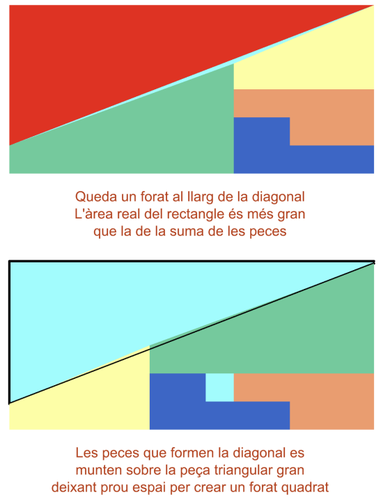 Si ara comparem les àrees del quadrat i del rectangle observarem que hi ha una diferència d’un quadret. Si totes dues figures estan fetes amb les mateixes peces, com és possible?