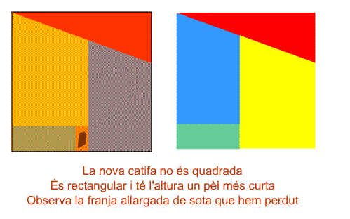 Com a tots els trencaclosques de “canvi d’àrees” les peces no acaben d’encaixar tan bé com a primer cop d’ull sembla. A més aquesta vegada es juga amb la vista d’una altra manera: la nova catifa no és quadrada sinó “quasiquadrada”. Es retalla una banda rectangular molt primeta.