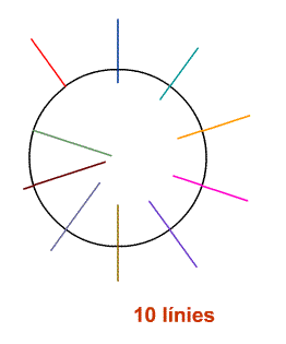 Mira bé el conjunt nou de nou línies de línies. Fixa-t’hi que les noves línies tenen dos colors i que són una mica més llargues: han crescut totes 1/9 sobre la seva longitud anterior.