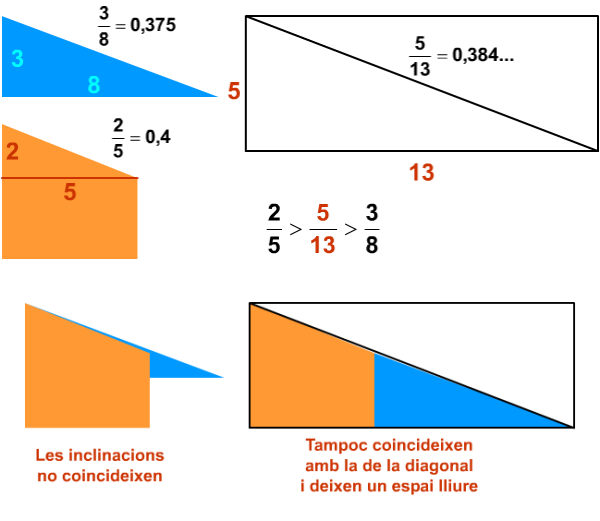 Si mirem la mesura dels “pendents” podrem observar, també, que les inclinacions de les hipotenuses dels triangles rectangles petits no coincideixen amb la del costat del triangle gran.
