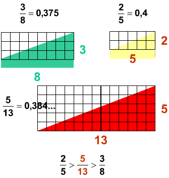 També podem mirar-ho des de la mesura de les inclinacions (o pendents) de totes les línies inclinades. Perquè tot fos perfecte haurien de coincidir exactament: la de la peça triangular, la de la trapezoidal i la de la diagonal del rectangle. Però, no és així. Si les calculem veurem que són diferents.