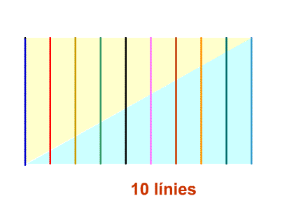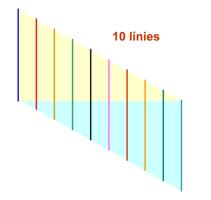 Observa aquestes 10 línies tallades per una altra en diagonal. Quan desplacem la part superior i es col·loca alineant de nous les rectes, en veiem només nou línies