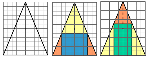 Observa aquests tres triangles que són exactament iguals: isòsceles, amb una base de 10 quadrets i una altura de 12. Dos d’ells han estat descompostos en altres figures més petites.