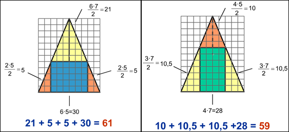 El vèrtex del rectangle que pertany al triangle de 61 d’àrea, està fora del costat del triangle gran. Per tant, el comptem amb mesures sobredimensionades. El real és una mica més curt i una mica més estret. Suficient per a sumar el quadret d’àrea que li sobra al càlcul que havíem fet.