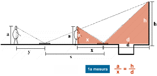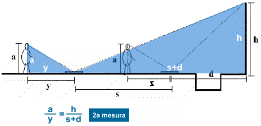Les mesures d i h són dues incògnites (de les quals només m’interessa h). Plantejant la proporció corresponent a cada triangle podrem obtenir un sistema d’equacions. Aïllant la d i aplicant el mètode d’igualació, es pot arribar a aconseguir una fórmula per calcular h. (Resolució completa en aquest enllaç)