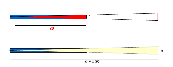 Si la proporció entre l’altura i la base del triangle interior és que l’altura és 20 vegades més gran la que hi haurà entre la distància a la cinta i el tros visible serà la mateixa. Per tant, només caldrà multiplicar per 20 (o 30, o 40… segons quina sigui la relació entre la llargada i el diàmetre del tub).
