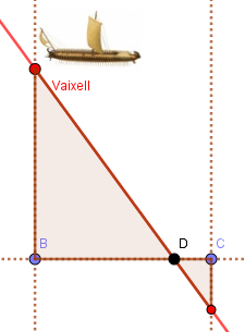 Ara ja ho tenim pràcticament. La distància que volem conèixer és BV. Quin costat del triangle DCF es correspon amb aquesta mesura? El costat CF, que només ens caldrà mesurar per saber la distància a què està el vaixell.