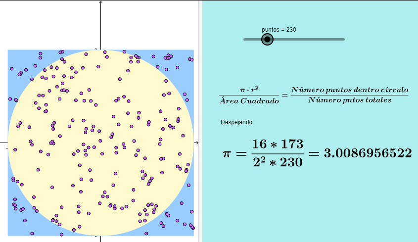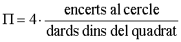 D’aquesta manera tenim, com abans amb les agulles, un nou mètode probabilístic de calcular el valor de Pi. Només cal multiplicar per 4 la probabilitat d’encert. Comencem a tirar dards i comptem quants els que queden dins del quadrat queden, a més, dins del cercle.