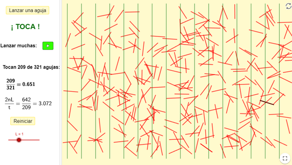 Imagina un conjunt de línies paral·leles a una distància D i unes agulles de longitud L que llencem a l’atzar sobre les línies.