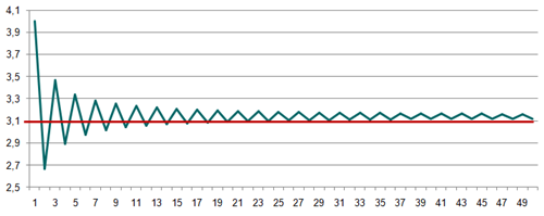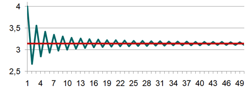 Com es pot veure al gràfic de sota cada vegada que afegim una fracció a la sèrie obtenim alternativament un valor per sobre o per sota de Pi, però amb una tendència a acostar-se a aquest. Si “anéssim” fins a l’infinit arribaríem a agafar-lo. La línia vermella representa el número Pi i la línia verda indica els resultats obtinguts cada vegada que augmentem la sèrie en una fracció.