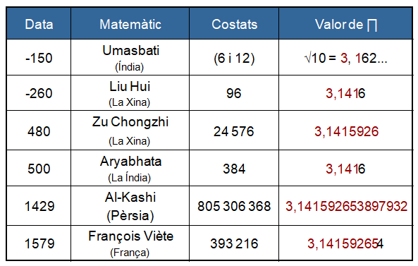 El matemàtic xinès Zu Chongzhi, fa uns 1500 anys, va arribar a calcular Pi amb un polígon de 24 576 costats. Més tard, fa uns 400 anys, el matemàtic francès François Viète va fer el mateix amb un altre de 393 216 costats.