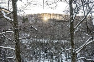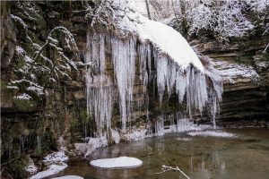 Ens enfilem per un camí molt ben arreglat, empedrat i formant graons, que segueix per la dreta del torrent, i ens endinsem en el bosc. Més endavant, un pont de fusta porta el camí a l’altra banda del torrent, i ara l’anem seguint per l’esquerra. En un ascens força còmode, ens condueix a un seguit de gorgs en què l’aigua, el gel i la neu formen escenografies màgiques que conviden tothom a treure el mòbil per capturar uns espectacles sorprenents. A la llum d’un dia que tot just es comença a desvetllar anem travessant un paisatge en blanc i negre on l’únic color el proporciona la nostra roba d’abric amb vermells o taronges que trenquen la fantàstica i caòtica harmonia B/N que ens envolta. Des que va nevar, fa dos dies, no deu haver fet gens de vent, perquè la neu s’aguanta fent equilibris damunt les branques.