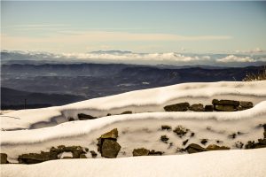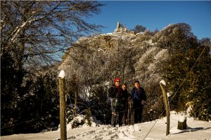 Reprenem la marxa i el gruix de neu va augmentant, encara que no presenta cap dificultat. Pols blanca tan sols trepitjada per alguna bestiola -potser un cabirol- que ha deixat el seu rastre travessant el camí. A la Serra de l’Obiol, els faigs il·luminats per un sol tímid dibuixen ombres allargades damunt la neu. Som molt petits enmig de tanta bellesa. Anem avançant sense dificultat, i a tres quarts d’onze arribem al Collet de l’Amorriador. La neu instal·lada a les branques altes dels faigs fa que semblin disfressats d’ametllers florits. Ben aviat veiem les runes del Castell de Milany enturonades damunt del promontori rocallòs. Quan hi arribem ens hi enfilem amb l’ajut d’algunes grapes que ens faciliten l’ascens. Són dos quarts de dotze. La panoràmica, amb aquesta atmosfera tan clara, és espectacular. Montseny, Montserrat, la Mola, cap al sud. Cap al nord, Pedraforca, Cadí, la Tossa d’Alp, i tota la blancor del Pirineu des del massís del Puigmal fins al del Canigó.