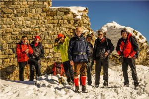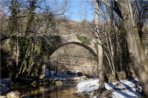 Ens fem la foto de grup davant les runes del que devia ser la torre de la fortalesa i comencem el camí de descens. L’estat de la neu fa més lleugera i còmoda la marxa enmig de faigs i boixos que suporten autèntiques muntanyes de neu. Finalment arribem a la pista que ens portarà de retorn cap a Vallfogona. No l’abandonarem fins que, ja veient el poble, agafem el corriol que ens fa de drecera fins al pont que ara ja podem veure a plena llum del dia en la seva esplendor. Arribem al poble a dos quarts de dues.