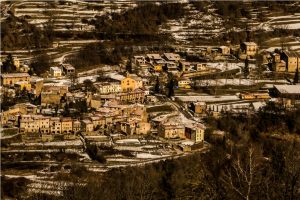 A un quart de vuit arribem a Vallfogona, que ens acull en silenci amb un dit de neu als carrers. Amb un parell de graus negatius i gens de vent ens posem les botes i ens abriguem bé, i a dos quarts de vuit comencem a caminar il·luminant el camí amb els frontals. Creuem el casc antic de la població i iniciem el descens cap al pont medieval. Per variar, avui la sortida comença de baixada, i en Jesús comenta que això no li agrada. De seguida arribem al riu, passem pel pont i a bona marxa -la fresca ajuda- ens anem allunyant de Vallfogona per un camí ample que travessa els conreus que envolten del poble, encara mig a les fosques. Neu al terra i a les branques.