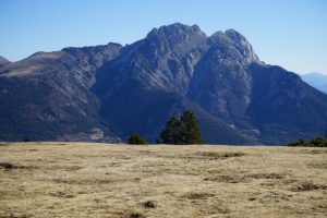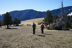 Hem començat a caminar que encara no eren les vuit. Havíem deixat els cotxes una mica més amunt de Gòsol i abans d’arribar a l’Ermita de Santa Margarida. Després d’una parada de rigor a l’Ermita ens hem anat enfilant seguint en GR150 fins al Coll de la Mola, amb el Pedraforca a l’esquena i, a partir d’aquest punt, hem abandonat el GR i hem girat cap al sud cap al Portell de l’Ós. Els nius de processionàries, sobretot a les zones baixes del nostre itinerari, guarnien els pins com si fossin boles de plata nadalenques i donaven als arbres un aspecte lamentable. Quan hem sortit del bosc i tot just entrant al Planell de la Font hem fet una pausa per esmorzar. Tots hem coincidit que es tractava d’un esmorzar de luxe gràcies a la comoditat de l’herba, l’escalfor del sol, la majestuositat del panorama, i, per descomptat, la teca de cadascú i el cafè calent compartit d’en Mingo (val a dir que en Carlos, que sempre pren infusió, avui estrenava un termo nou).