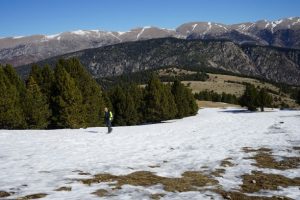 Havent esmorzat, hem anat avançant pel Planell de la Font, amb amples panoràmiques a dreta i esquerra, trepitjant l’herba amable i, quan hem encarat el pendent cap al cim, hem començat a trobar clapes de neu força dura. No hem fet ús dels grampons i ens hem enfilat sense cap dificultat fins al Cap del Verd. Allí ens esperaven un parell de taules d’ori