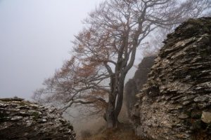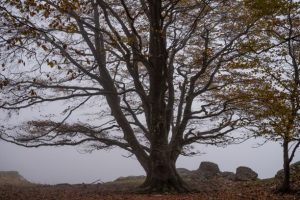 A partir d’aquí, i seguint el camí ben marcat, hem anat passejant pel llom de la carena, caminant entre els faigs i la boira. La panoràmica inexistent ha quedat del tot compensada per l’espectacle del bosc de tardor banyant-se en la boira. Fins que, ja pels volts de les deu hem fet una parada per esmorzar, ja a la base del puig de les Bruixes.