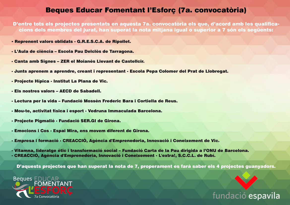 Avui, a l’Institut d’Estudis Catalans de Barcelona, la Fundació Espavila ha fet l’acte d’entrega de la 7a convocatòria de les Beques Educar Fomentant l’Esforç. L’objectiu de la convocatòria és estimular i promoure totes aquelles iniciatives que es duguin a terme a Catalunya en l’àmbit educatiu i lúdic de 0 a 18 anys per promoure la cultura de l’esforç inculcant valors fonamentals com ara treball, responsabilitat, sinceritat, optimisme, etc.