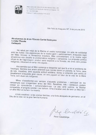 En Pere Casaldàliga desde el Brasil ens ha contestat a la Carta que li vam enviar,explicant les nostres activititats de la Diada de la Pau.