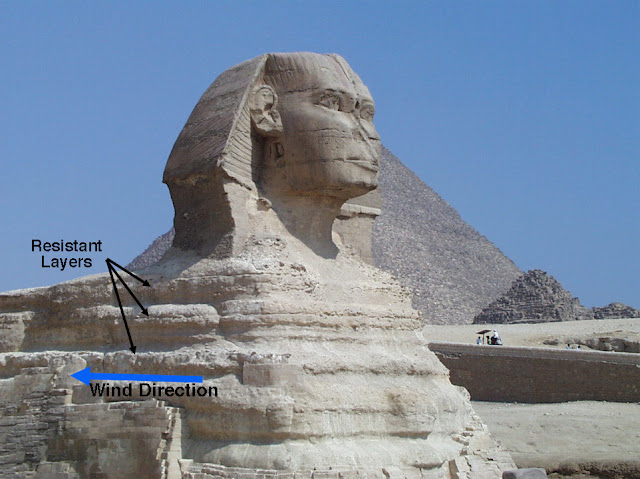 L’Esfinx, als afores del Caire, Egipte, és un bon exemple de l’erosió eòlica. Des de la seva creació fa aproximadament 4500 anys , la base de l’Esfinx ha patit una erosió eòlica significativa (excepte durant un breu període d’inundació al voltant del 2000-1000 aC) al llarg de les cares de la base que són més o menys paral·leles a la la direcció del vent, tal com es mostra a continuació.