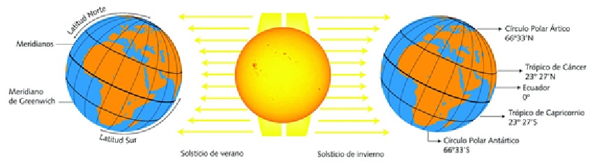 El Sol es desplaça durant l’any sobre l’esfera celeste cap al nord i cap al sud 23.5 graus des de l’equador celeste. Aquest canvi aparent de la posició del Sol durant l’any es deu a la inclinació de l’eix de rotació de la Terra, que és exactament de 23.5 graus. Durant sis mesos s’observa com el Sol es mou sobre l’esfera celeste cap al nord i els altres sis mesos cap al sud, això fa que els hemisferis nord i sud rebin més radiació solar durant una època de l’any, l’estiu i menys durant l’hivern; és la raó per la qual es donen les estacions. Els punts de l’esfera celeste en els quals el Sol creua des del nord cap al sud i viceversa es diuen equinoccis; això succeeix aproximadament el 21 de març i el 22 de setembre quan s’inicien la primavera i la tardor en l’hemisferi nord, respectivament, i viceversa en l’hemisferi sud.
