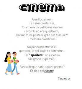 Com cada any per aquestes dates, en motiu de la celebració de la diada de Sant Jordi, els i les alumnes de l’escola preparem un poema i participem al certamen dels Jocs Florals. Aquest any la temàtica ha estat el CINEMA. Aquí teniu les produccions de la classe de les Àguiles. Estem molt satisfets/es i esperem que us agradin!
