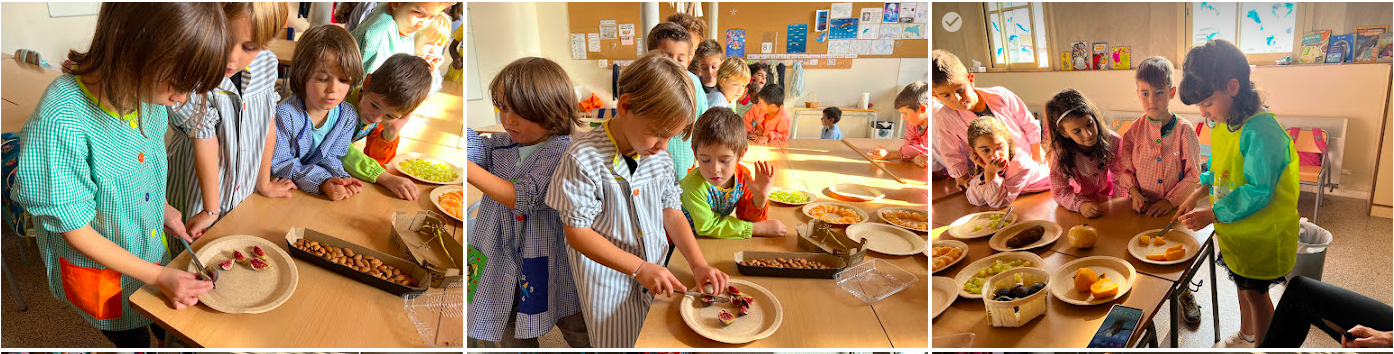 Els Dofins ens hem preparat un bon banquet de fruites de tardor. Hem rentat, tallat i emplatat la fruita. Després l’hem degustat posant a prova el nostre sentit del gust i l’olfacte intentant endevinar quina fruita ens havien posat a la boca. Recordeu els noms de les fruites que hem degustat?