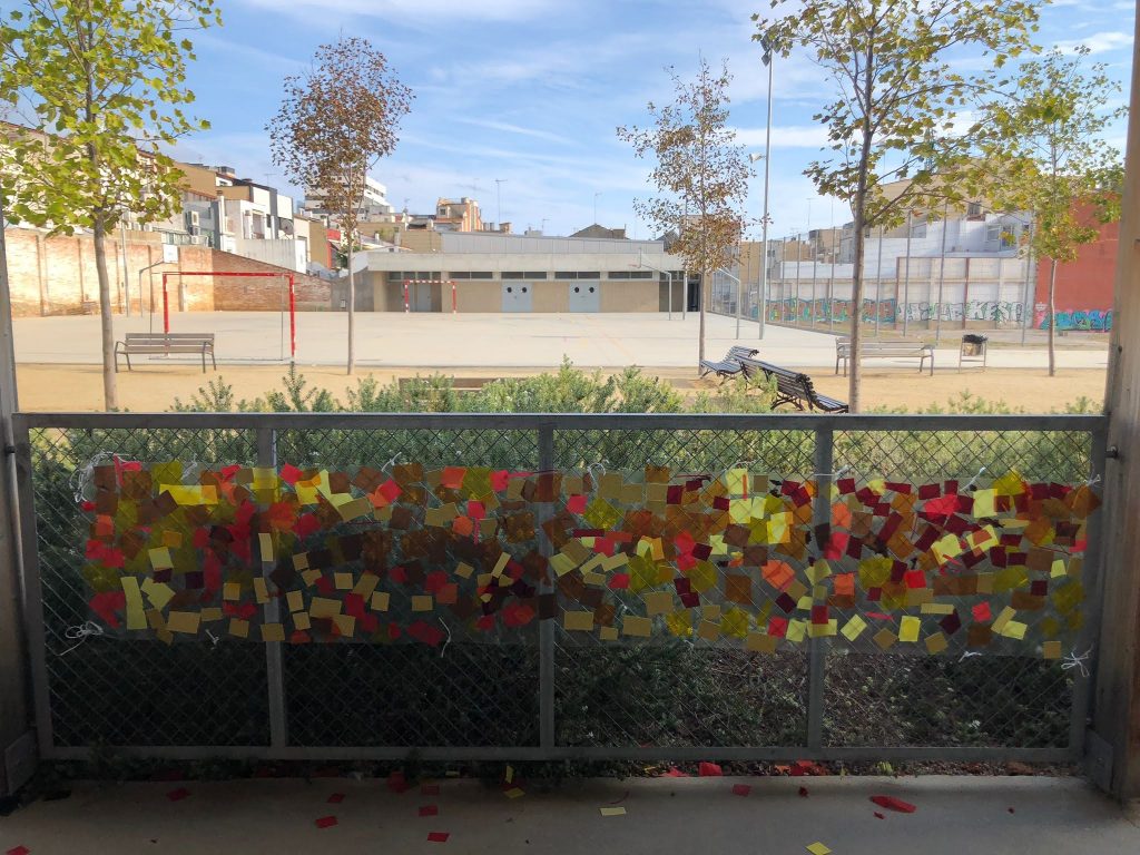 A plàstica vam fer un vitrall de tardor xulíssim! Vam sortir al porxo de l’escola i allà ens vam trobar un tros gran d’aironfix penjat a la reixa i unes safates plenes de diferents trossets de papers de colors de la tardor. Tots junts vam anar creant el vitrall agafant els papers que més ens agradaven i enganxant-los a l’aironfix. Ens ho vam passar molt bé!! Cliqueu a la imatge per veure més.