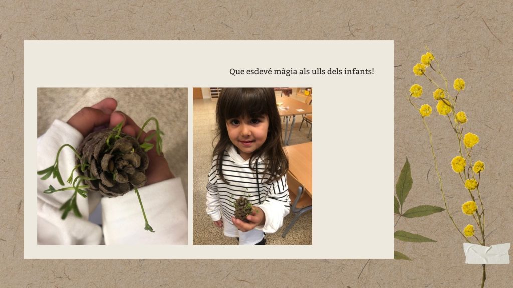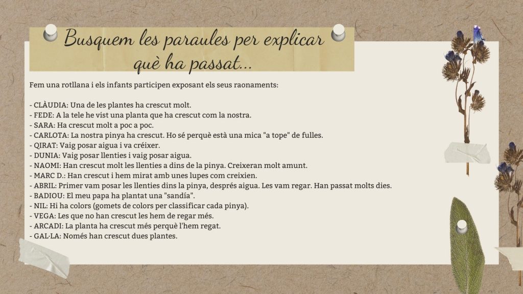 Un dia l’esquirol Aniol ens va plantejar un repte: germinar llenties. Pas a pas vam preparar el que necessitàvem (pinyes buides, llenties, pipetes, aigua i lupes). Seguidament per taules vam posar les llenties delicadament dins els buits de la pinya, les vam regar i durant uns dies cada matí a l’entrar a l’aula observàvem com s’esquerdaven les llavors i en creixien plantetes.