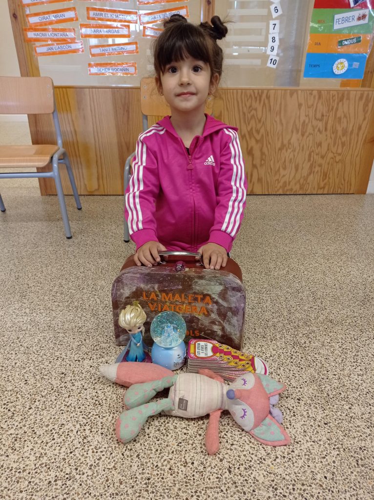 Aquesta setmana li ha tocat a la Dunia la maleta viatgera! Ens ha ensenyat les cosetes que a ella més li agraden. Ha començat, per el peluix de guineu que li va regalar la seva àvia i que se l’estima moltíssim, seguidament ha tret de la maleta una nina de l’Elsa de “Frozen” i ens ha cantat un tros de la cançó que canta aquest personatge. Després, hem apagat les llums de l’aula i ens ha ensenyat una bola de llum i música, i per acabar, ens ha explicat un conte d’una nena que aprenia a cordar-se les sabates.