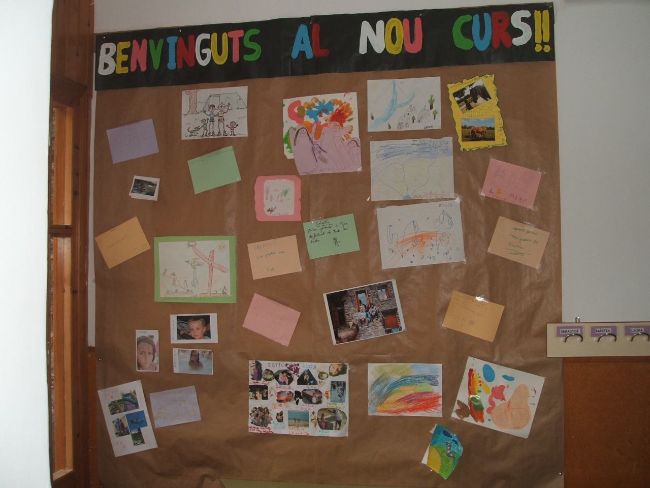 Aquest és el mural de benvinguda al curs que vam fer amb tots els nens i pares el primer dia de curs. Vam anar enganxant alguna foto, algun dibuix, alguna cosa significativa de cada nen/a. Això ens ha servit per coneixer-nos una mica més. Una manera d’expressar-se oralment del més gran al més petit.