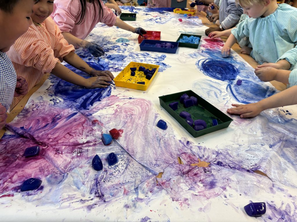 També pintem amb glaçons dels colors de l’hivern: rosa, lila, blau… Quan el gel es desfà deixa el color al paper. D’aquesta manera veuen què passa quan el gel es converteix en aigua.