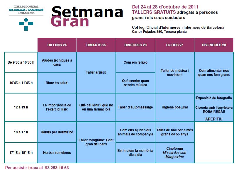 La setmana pròxima l’escola Fluvià participa en els tallers de la Setmana Gran a l’escola d’infermeria. Recordeu que tots els avis de l’escola hi poden assistir de manera gratuïta. Us heu d’inscriure trucant al telf. 93 253 16 63. El dimarts 25 els infants els Naturalistes (1r) participaran al taller artístic i el dijous els Bombers i bomberes (1r) ho faran al de música i moviment. Necessitem la vostra participació perquè l’experiència sigui un èxit!!!