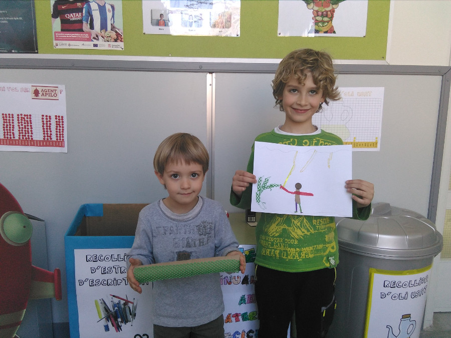 Aquesta setmana els germans Masip-Reves ens han portat una treballs amb material reciclat. L’Aniol ha fet un cocodril el Guerau un dibuix de Sant Jordi amb el drac.