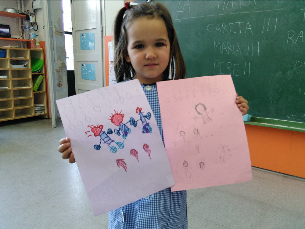 La Vinyet ens ha portat dos dibuixos que ha fet a casa. A un ha dibuixat al papa i a la mama amb floretes i a l’altre s’ha dibuixat a ella.