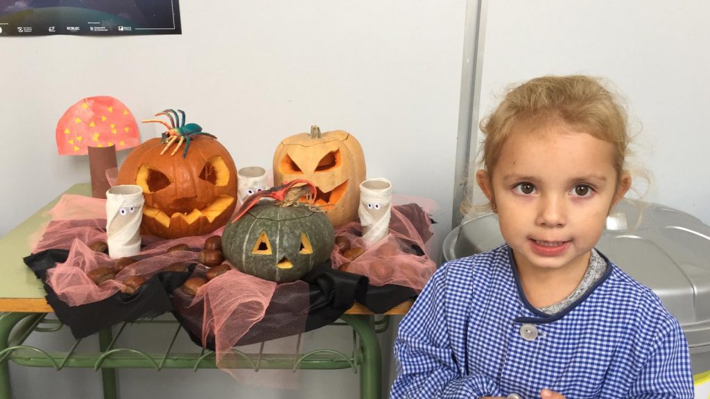 També, ens ha portat una safata de Halloween on hi ha carabasses, castanyes i mòmies amb rotlles de paper de WC.