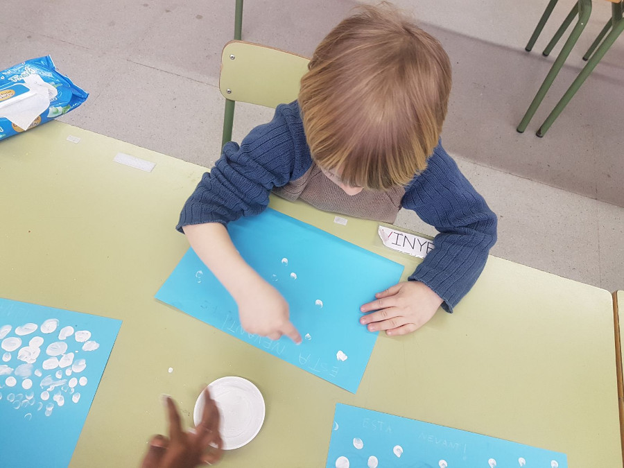 Aquesta tarda, aprofitant que ha començat a nevar hem fet un dibuix amb pintura per a fer els floquets de neu.