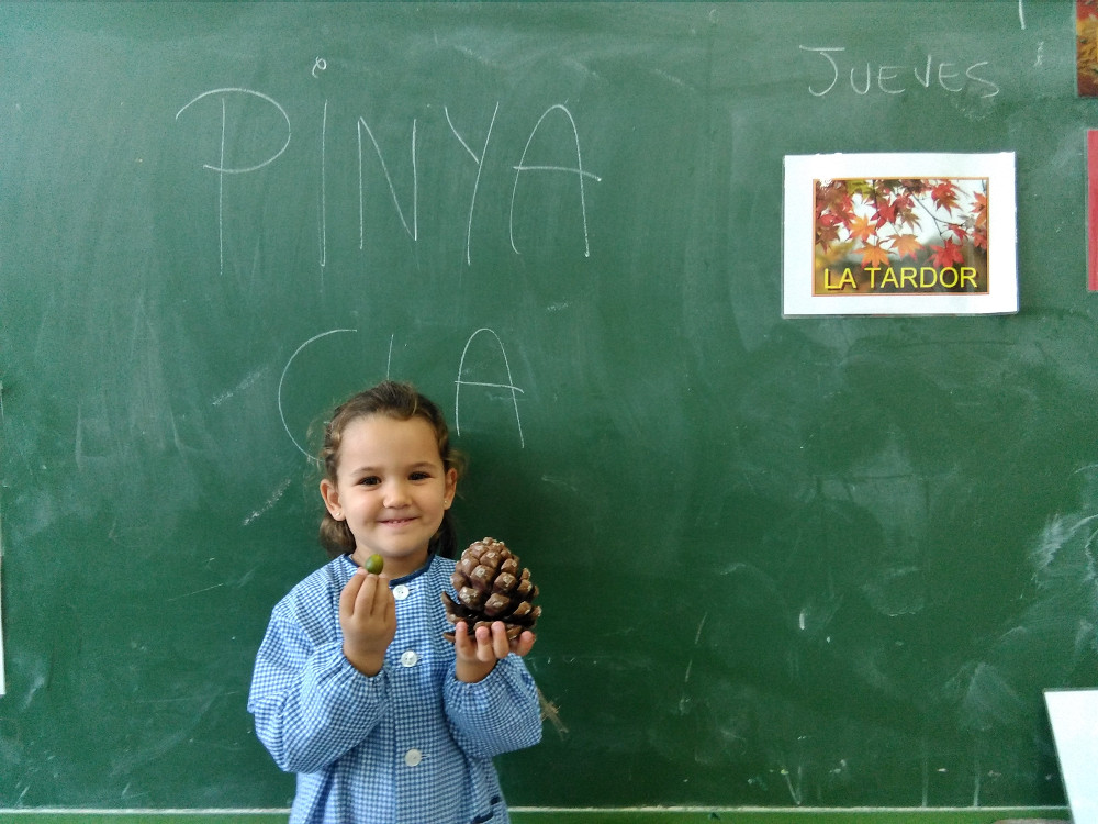 Avui, la Vinyet ens ha portat una pinya amb pinyons i glans que ha trobat el padrí Josep al bosc.