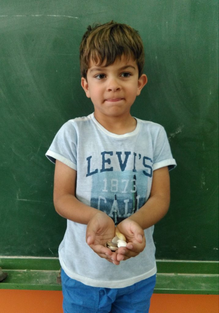L’Aniol ha vingut super carregat de castanyes, glans, pedres volcàniques perquè ha fet una excursió a la Cova del Tabac amb la seva família.