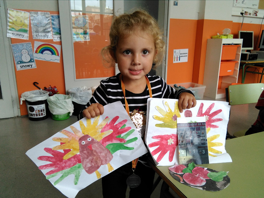 Avui la Noemí ens ha portat una medalla que li van donar a la Milla de Balaguer i unes fulles que ha fet a casa amb pintura. Ens ha agradat molt.