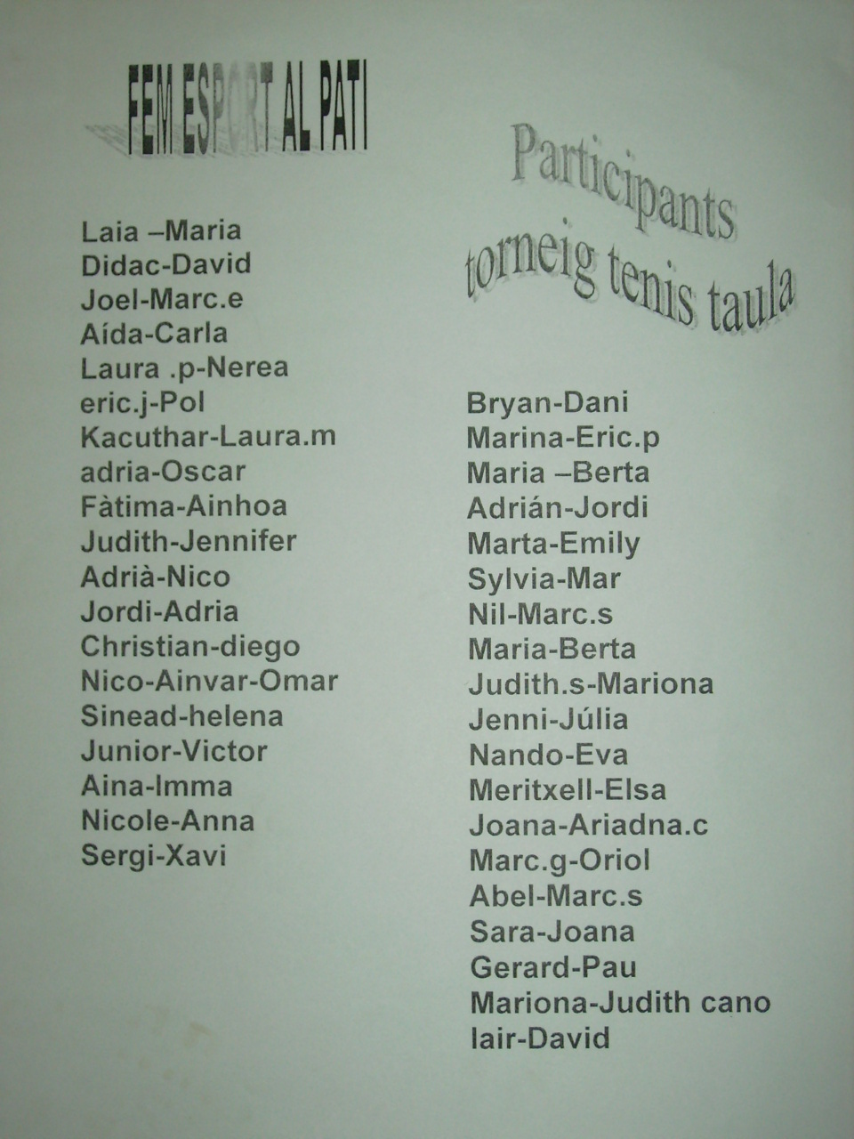 Dídac 5è Nico 4t Joel 5è Ferran 4t Víctor 5è David P. 4t Maria 5è Helena 4t Anna 5è Berta 4t Eva 5è Esther 4t |
