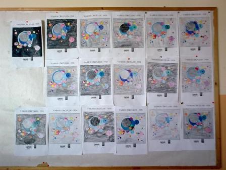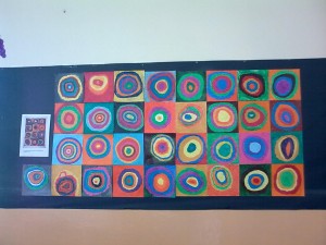 La primera activitat que vam fer va ser  un mural entre tots, imitant el seu quadre “Cercles concèntrics de colors”. Vam utilitzar les ceres perquè s’aconsegueixen uns colors molt vius i uns resultats molt espectaculars.