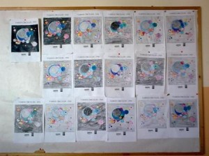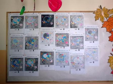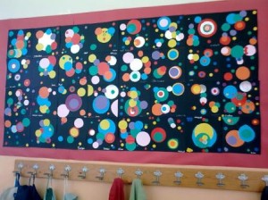 Vam seguir treballant amb el compàs i a continuació vam fer una  mena de collage amb cercles  de papers de colors sobre un fons negre. Cada nen i nena havia d’intentar que el seu collage s’assembles al disseny que havia fet al seu bloc de dibuix.  Amb els treballs de tots els nens i nenes hem  format un gran mural al passadís. Què us sembla?