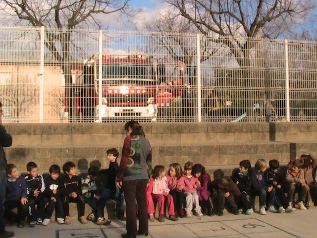 Com cada any realitzem un simulacre a l’escola amb col·laboració d’una dotació dels bombers de la Generalitat del parc de la Pera. Amb molta paciència i amabiltat expliquen als nens el funcionament del cotxe de bombers i diferents tècniques per apagar el foc i actuar en els sinistres.