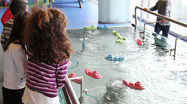 Uns mòduls escultòrics molt atractius i que s’expliquen sense rètols desvetllen la curiositat dels infants i els animen a jugar i experimentar amb propietats de la matèria, a comprovar la flotabilitat d’uns vaixells a la piscina d’aigua, a jugar amb bombolles de sabó perquè s’adonin de la seva fragilitat o del fet que sempre acaben tenint la mateixa forma, a experimentar amb miralls, a percebre la sensació que els produeix el vent en el seu propi cos o l’efecte que té sobre alguns objectes…